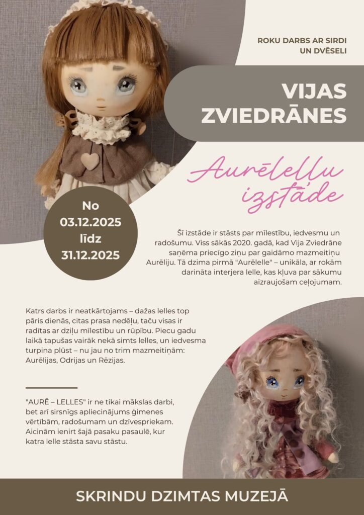 Vijas Zviedrānes “Aurēleļļu izstāde” Datums: 03.12.2025 - 31.12.2025Laiks: Norises vieta: Skrindu dzimtas muzejs No 3. līdz 31. decembrim Skrindu dzimtas muzejā skatāma Vijas Zviedrānes “Aurēleļļu izstāde”.