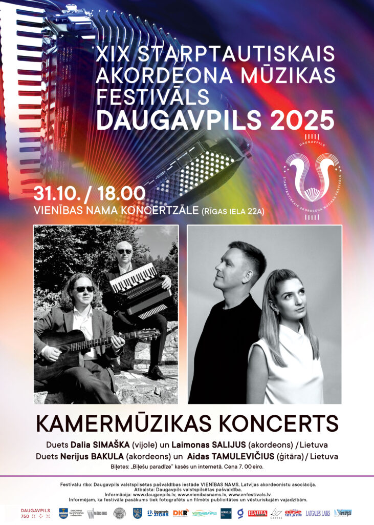 Šī gada 31. oktobrī plkst. 18.00 Daugavpils Vienības namā ar kamermūzikas koncertu savu skanējumu uzsāk XIX Starptautiskais akordeona mūzikas festivāls „Daugavpils 2025”.