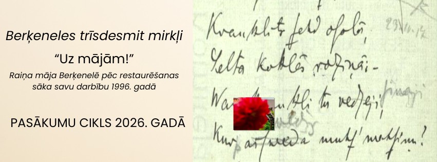 Raiņa romānā dzejoļos „Dagdas piecas skiču burtnīcas”, kas tapis emigrācijas laikā Šveicē, ir nodaļa „Vienīgā aina”, kas veltīta Berķenelei. Dzīve svešumā vedinājusi domāt par pagātni, dzimteni, tēva mājām. Dzejnieka vārdi ir sirsnīgs apliecinājums tam, cik iedvesmojoša ir bijusi bērnība Berķenelē, kas šādi ir iezīmēta Latvijas kultūras vēsturē. Tāpēc arī pasākumu cikls „Uz mājām!” ir sadalīts deviņās daļās jeb ainās – analoģijā ar Raiņa dzejoļiem par Berķeneli krājuma „Dagdas piecas skiču burtnīcas” nodaļā „Vienīgā aina”.