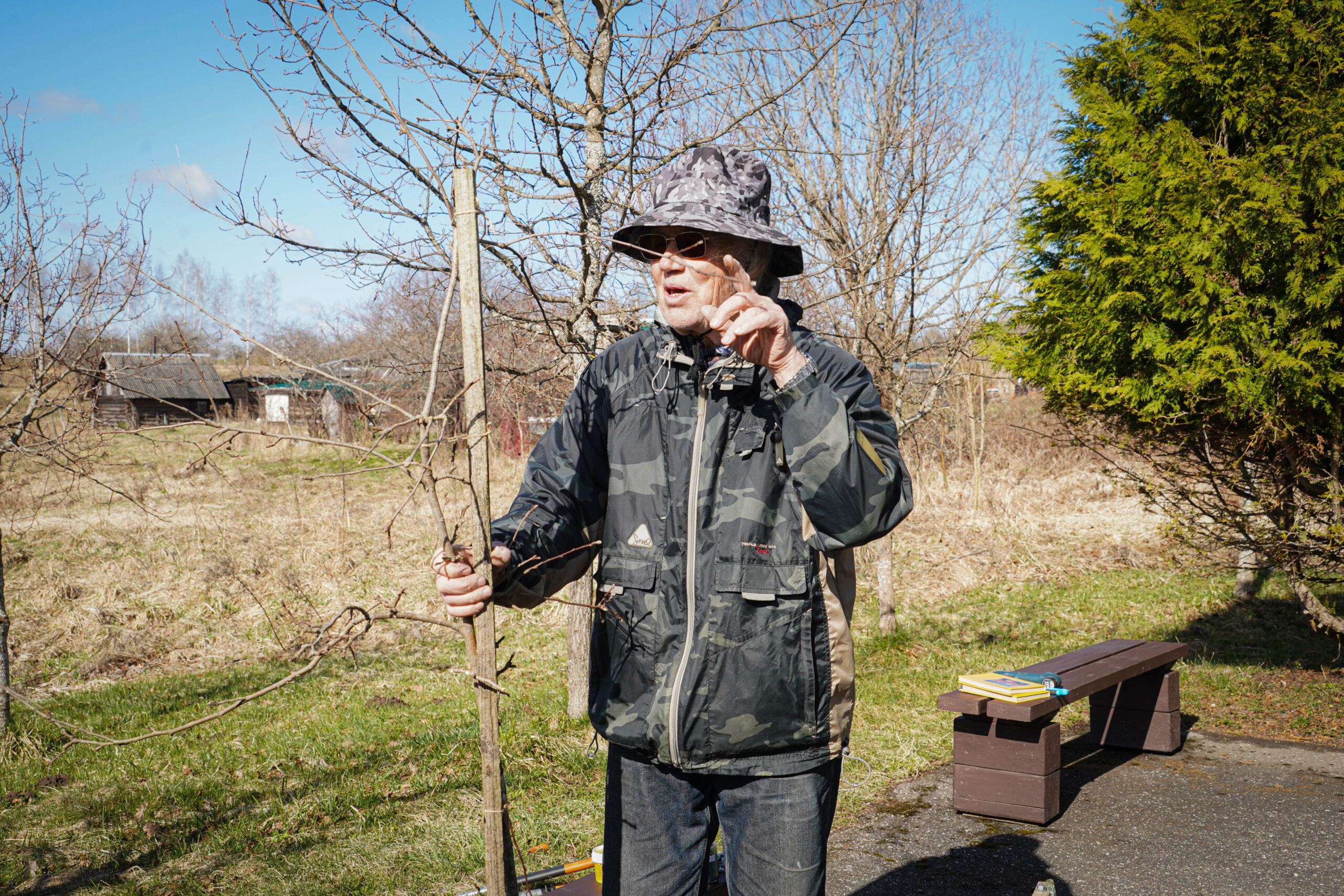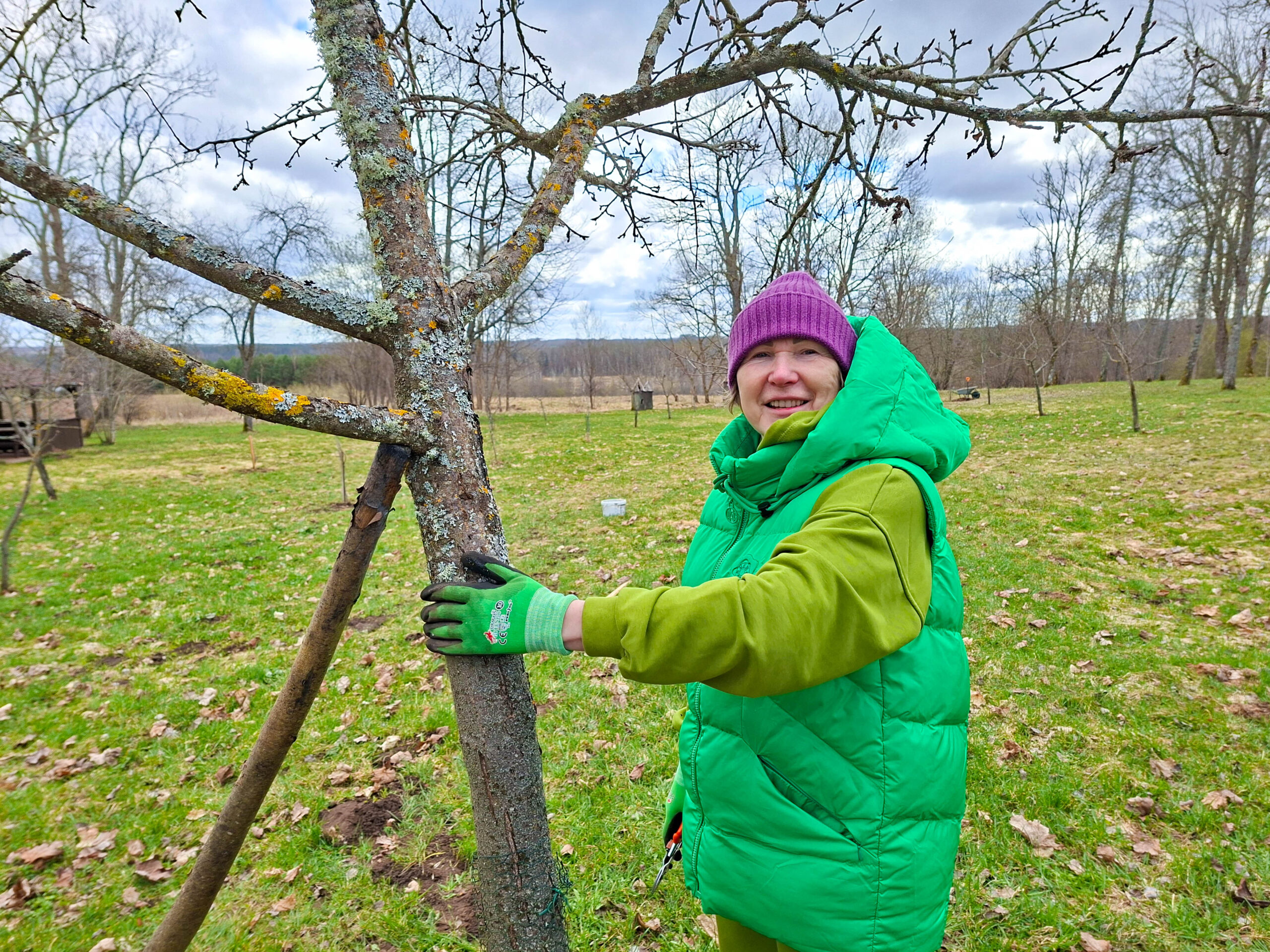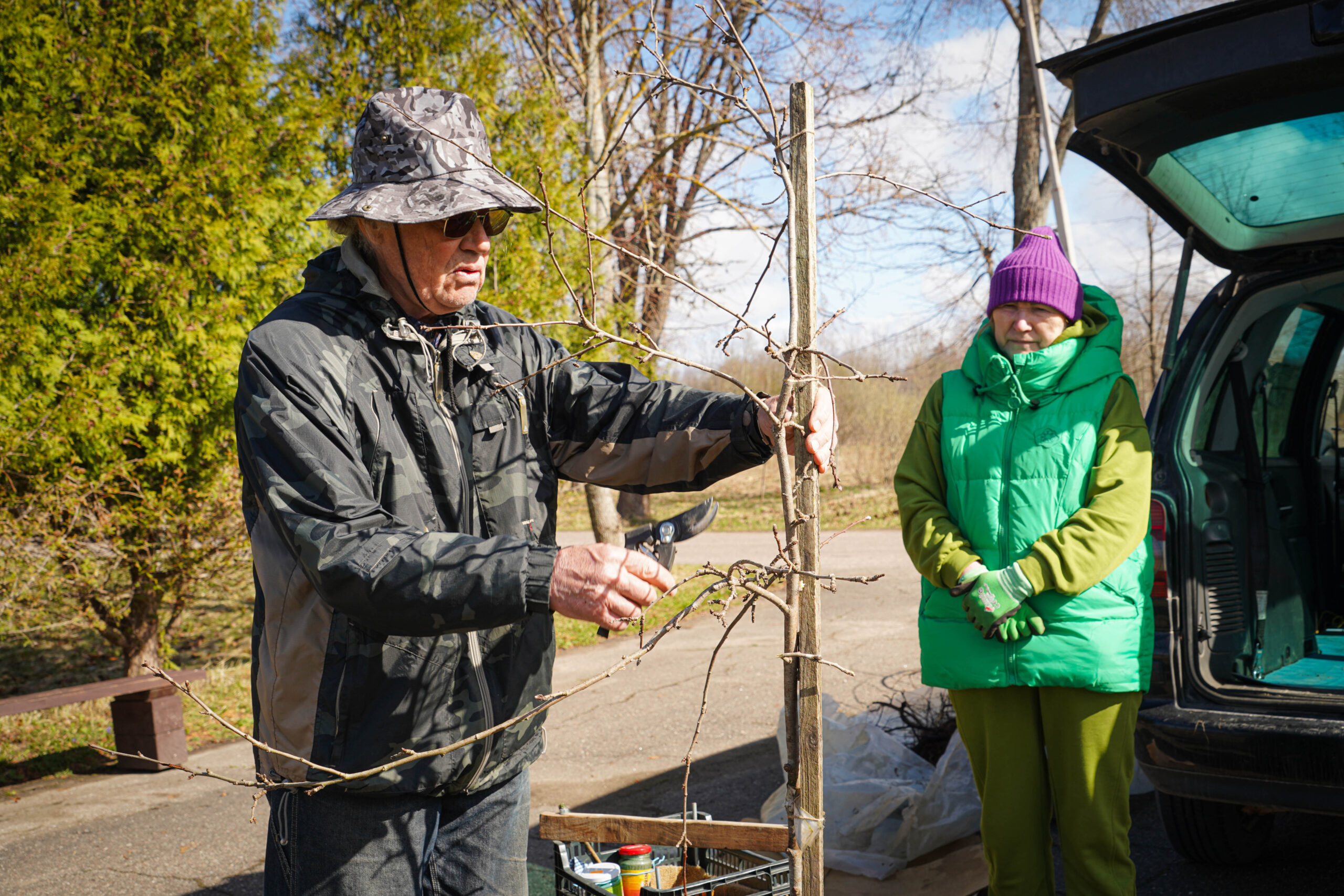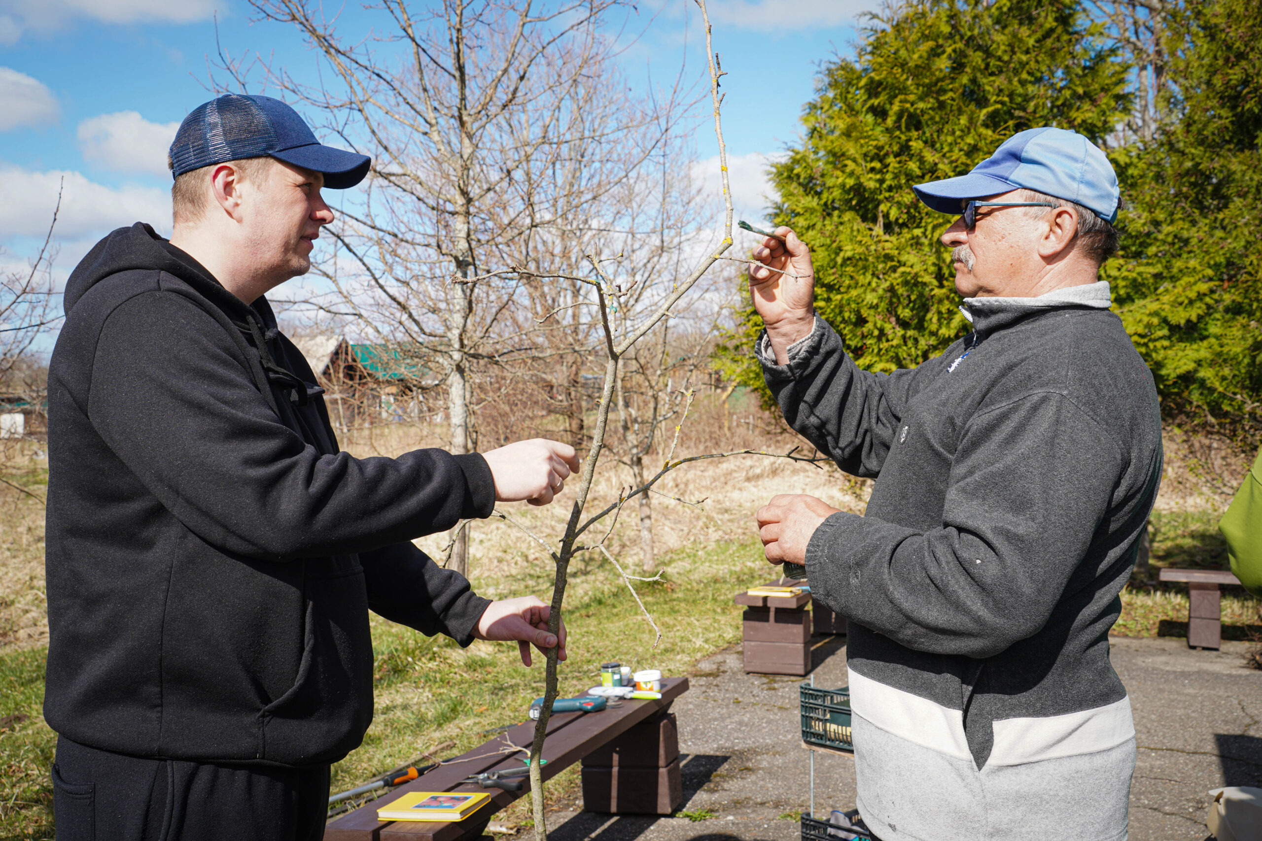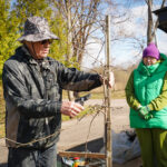 No savas saimniecības augļkopis atveda vairākus ābeļu un bumbieru kociņus, rādīja, kā tiem pareizi apgriezt nevajadzīgos zarus, apstrādāt griezuma vietas, stādīt un piesiet, lai veidotos pareizs koka vainags un taisns stumbrs, kā arī dalījās dažādos citos noderīgos padomos.