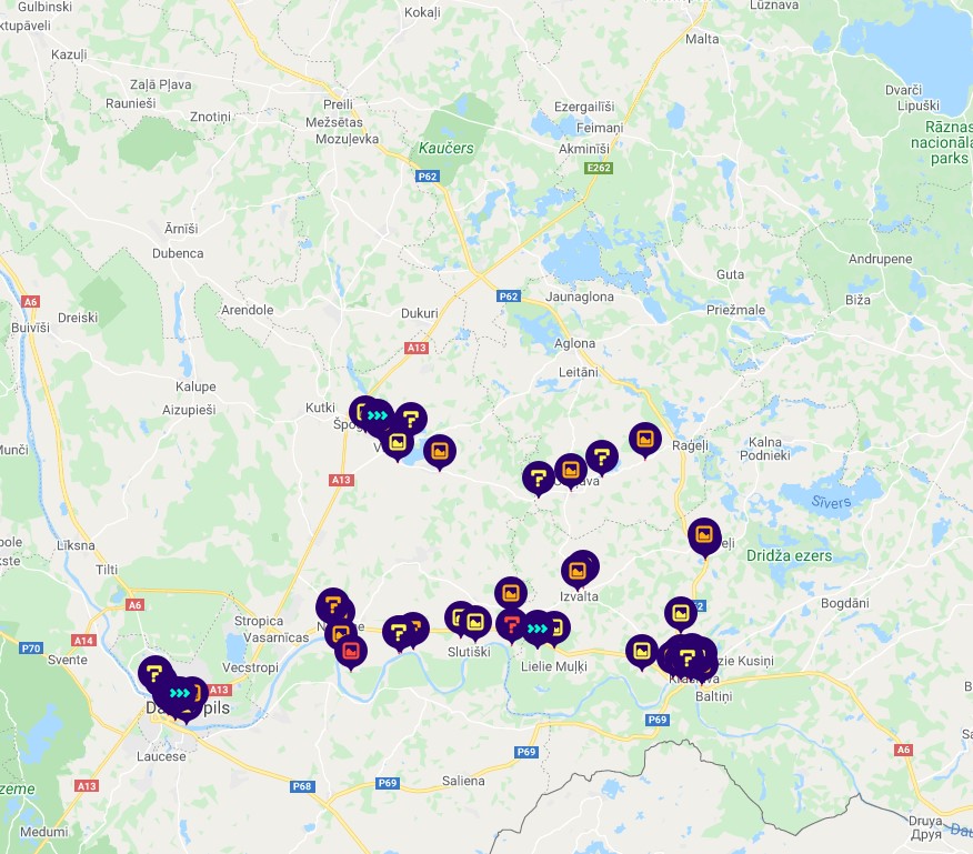 Aizvijies līdzi Daugavas deviņiem lokiem no Daugavpils līdz Krāslavai! Auto orientēšanās spēle vedīs uz gleznaino Daugavas senleju. Turklāt, kāpjot augšup pa Vasargelišķu un Priedaines skatu torņu kāpnēm, tā vien šķiet, ka šis Latgales piedzīvojums Tevi cels tuvāk debesīm! Nonāksi ciemā ar neparastu nosaukumu – “Lielie Muļķi”, kas 2019. gadā pārtapis par TV komēdijseriāla nosaukumu. Apskatīsi Daugavpils cietoksni, kas 1812. gadā bija Napoleona franču armijas cīņas vieta, un tiksi izaicināts stāties pretī “Cietokšņa spokam”. Atklāsi mazo Šveici Latgalē, saklausīsi Juzefovas vēja zvana skaņas un veltīsi laiku vietējo iedzīvotāju kultūras un viesmīlības iepazīšanai.