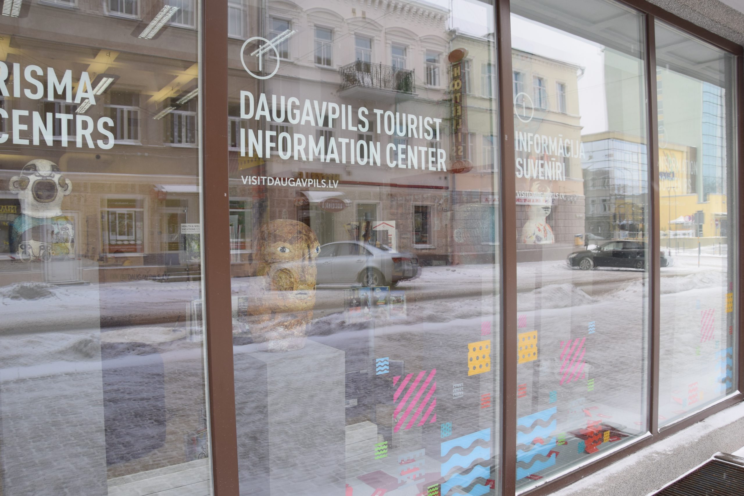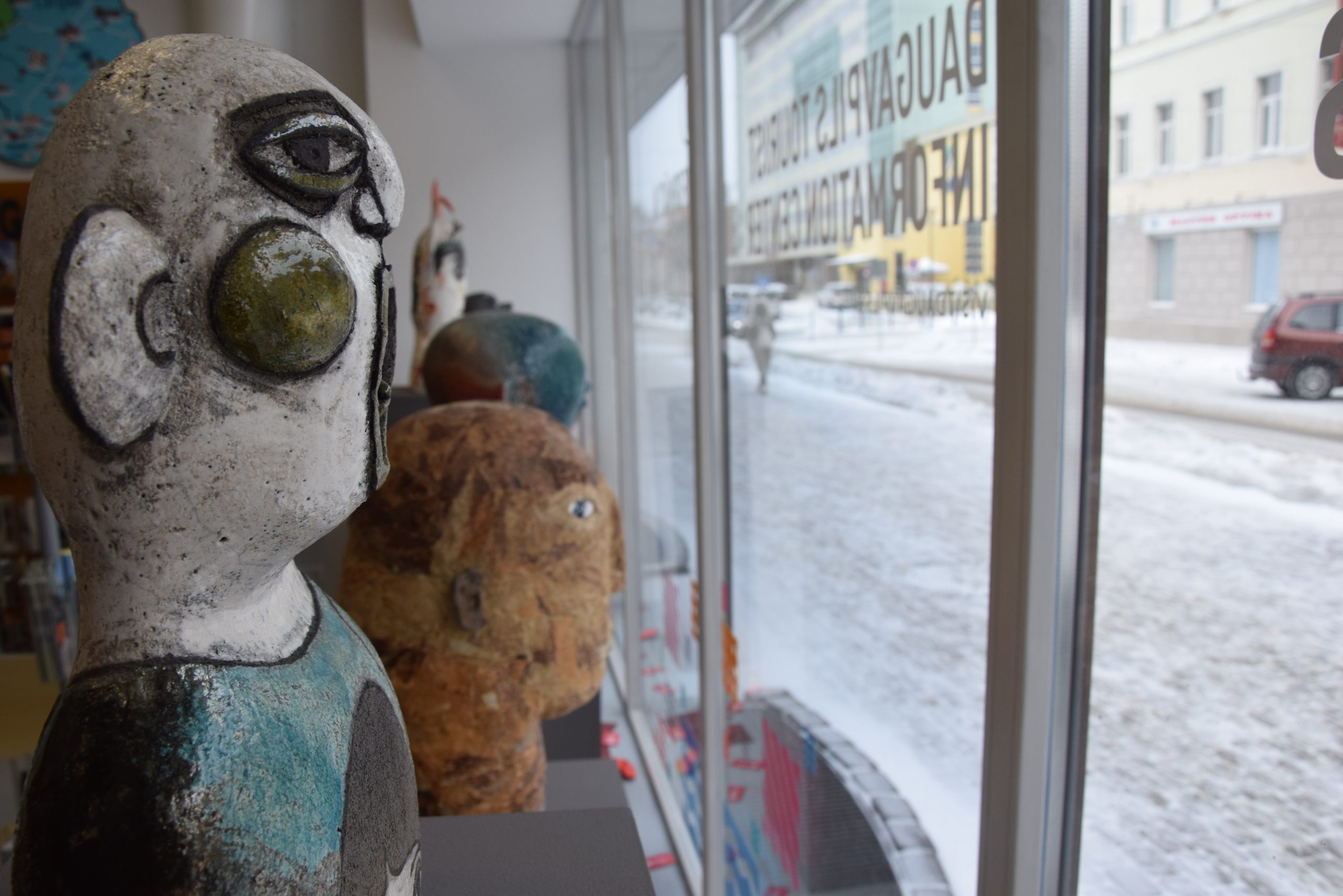 Тем временем, витрину Даугавпилсского центра туристической информации – такую же разноцветную, как и сам Даугавпилс – оживляет пятерка керамических лиц, которые выполнены в разных техниках. Работы Янины Мироновой (Польша), Юлии Репиной (Россия) и Иевы Юрка (Латвия) созданы здесь, в Даугавпилсской крепости, в ходе творческих симпозиумов «Лаборатория керамики». В свою очередь, работы Анет Дефорт (Бельгия) и Клауса Гутовского (Австралия) попали в коллекцию Центра Ротко по итогам Латвийской биеннале керамики.