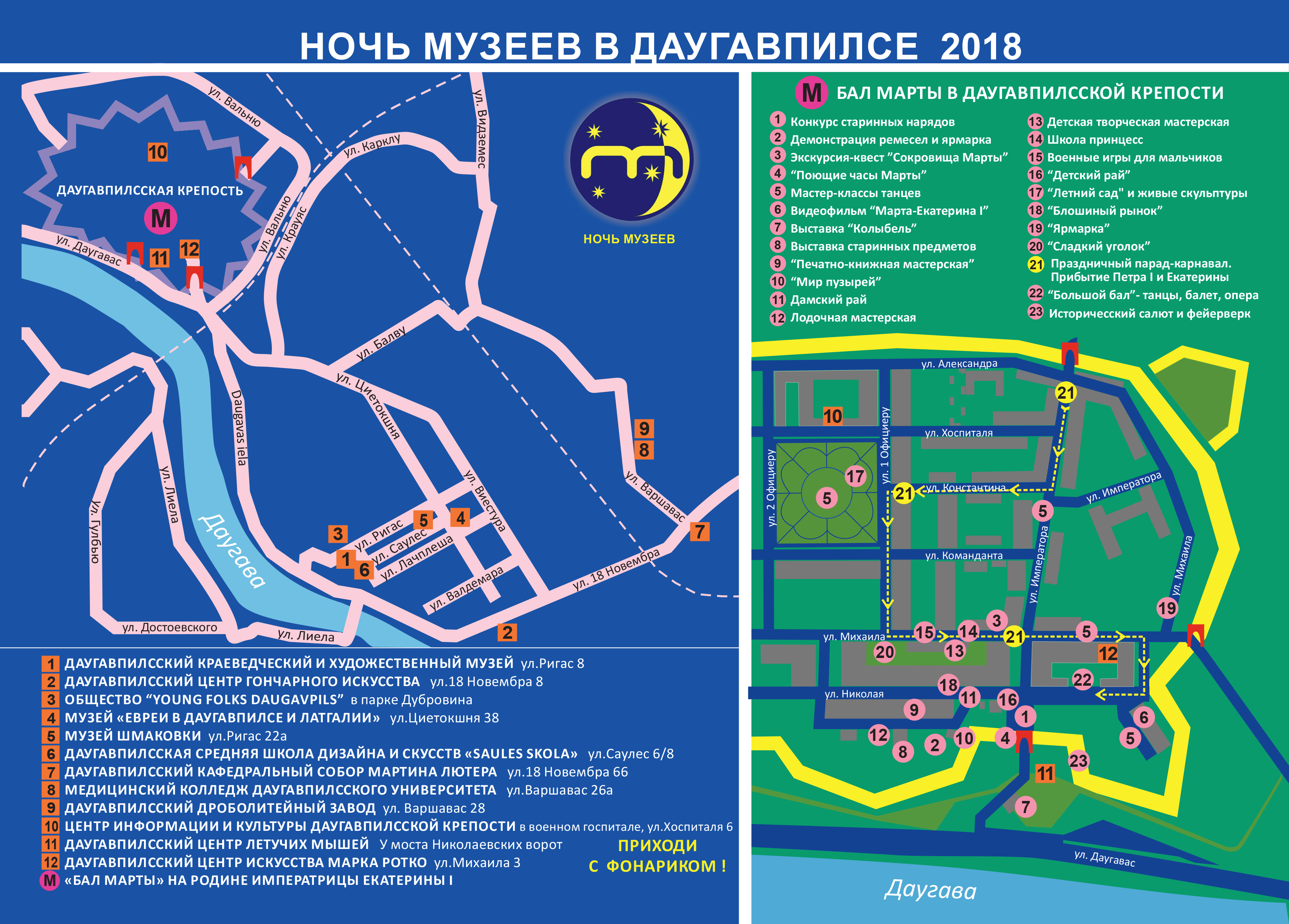 Чтобы не потеряться в вихре чудес Ночи музеев, 19 мая на местах проведения мероприятий будут выдаваться карты Ночи музеев, которые помогут найти дорогу к наиболее интересным объектам. Они будут доступны так же на домашних страничках Даугавпилсского самоуправления www.daugavpils.lv, Даугавпилсского краеведческого и художественного музея www.dnmm.lvи Даугавпилсского туристического информационного центра www.visitdaugavpils.lv.