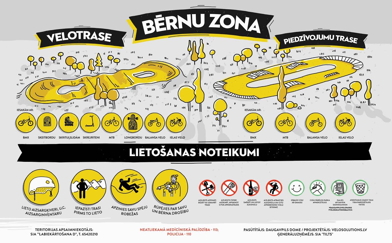 Велотрасса, предусмотренная для велосипедистов всех возрастных категорий и уровней подготовленности, является местом для активного отдыха. Это специально сконструированная асфальтовая трасса, состоящая из горок разного размера, виражей и небольших трамплинов. При ускорении, съезжая с горок, велосипедист может активно кататься, не используя при этом педали. Велотрасса очень удобна, так как вся территория свободно просматривается с любой точки, а риск столкновения исключён. По обе стороны трассы – мягкий газон.