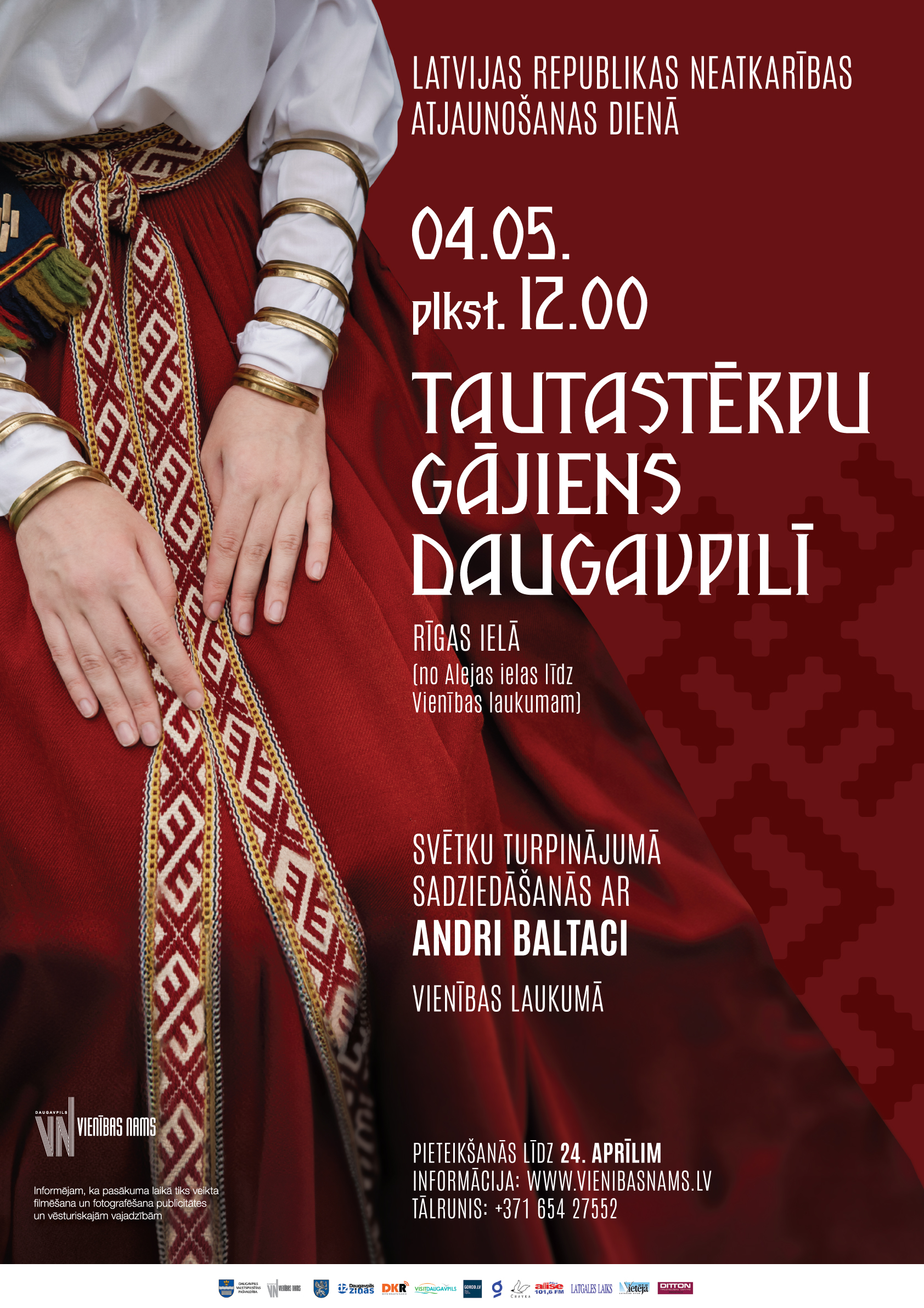 Informējam, ka Daugavpils valstspilsētas pašvaldības svētku ietvaros rīkoto pasākumu laikā tiks veikta fotografēšana, video un/vai audiovizuāla fiksācija. Iegūtie materiāli tiks izmantoti ilustratīvi mākslinieciskiem mērķiem un publicitātei pašvaldības mājas lapā un sociālajās vietnēs.