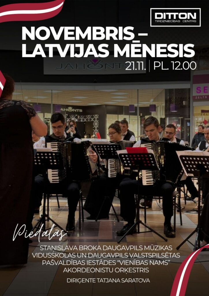 Šī gada 21. novembrī plkst. 12.00 tirdzniecības centrā “DITTON” (Cietokšņa ielā 60) notiks Staņislava Broka Daugavpils mūzikas vidusskolas un Daugavpils valstspilsētas pašvaldības iestādes “Vienības nams” apvienotā akordeonistu orķestra (mākslinieciskā vadītāja Tatjana Saratova) koncerts “Novembris – Latvijas mēnesis”.